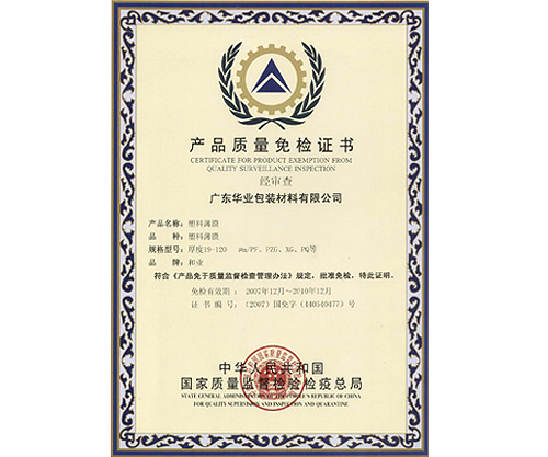 由我司生产的“和业牌”塑料薄膜系列产品经审查符合《产品免于质量监督检查管理办法》规定,获得中华人民共和国国家质量监督检验检疫总局颁发的“产品质量免检证书”。