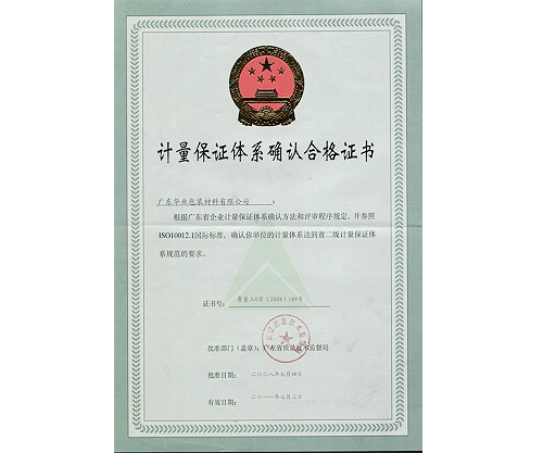 2008年7月,由广东省质量技术监督局根据广东省计量保证体系确认方法和评审程序规定,并参照ISO10012.1国际标准,确认我司的计量体系达到省二级计量保证体系规范的要求。