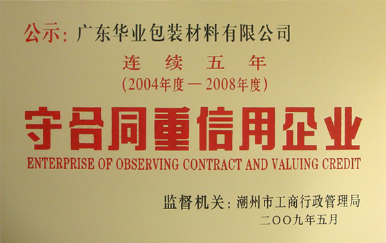 本司讯:2009年5月,我司被潮州市工商行政管理局评为连续五年守合同重信用企业(2004-2008年度)。信用是本,无信不兴。信用是市场经济的重要基础,良好的信用关系是企业正常经营与国民经济健康运行的基本保证。
