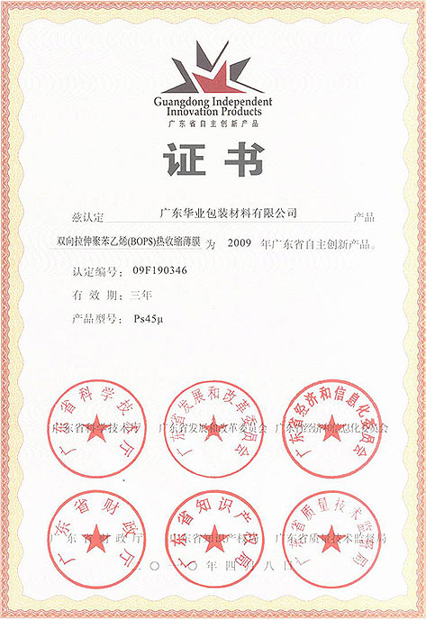 本司讯:今日,我司研发的双向拉伸聚苯乙烯(BOPS)热收缩薄膜通过由广东省科学技术厅、广东省发展和改革委员会、广东省经济和信息化委员会、广东省财政厅、广东省知识产权局、广东省质量技术监督局的联合认定,被评为广东省自主创新产品。