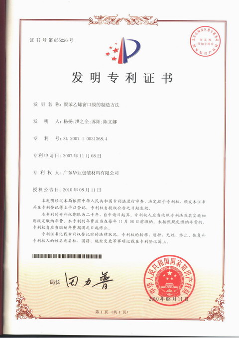2010年8月11日“聚苯乙烯窗口膜的制造方法”获得国家知识产权局的专利授权。