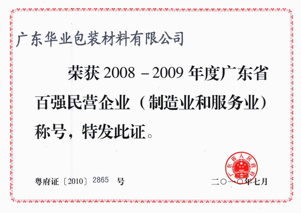 本司讯 今年七月,我司荣获2008-2009年度广东省百强民营企业(制造业和服务业)称号。