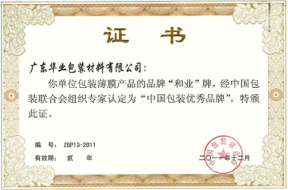 近日,我司生产的“和业”牌包装薄膜产品,经中国包装联合会组织专家认定为“中国包装优秀品牌”。
