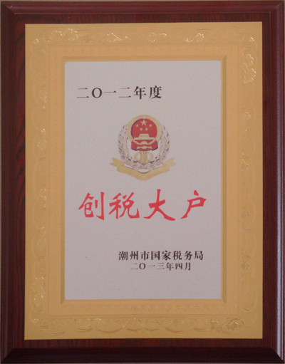 潮州市国家税务局发布2012年度“创税大户”和“创税重点企业”,我司依法诚信经营,不断推进企业创新,努力拓展国内外市场,在艰难的经济形势下取得了较好的经济效益和社会效益。同时,我司严格遵守税收法律法规、自觉履行纳税义务,为我市的税收收入增长添砖加瓦,被评为“创税大户”。