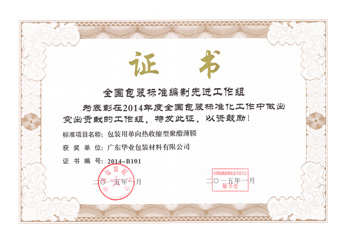 2015年1月,我司被中国包装联合会评选为全国包装标准编制先进工作组,标准项目名称:《包装用单向热收缩型聚酯薄膜》。