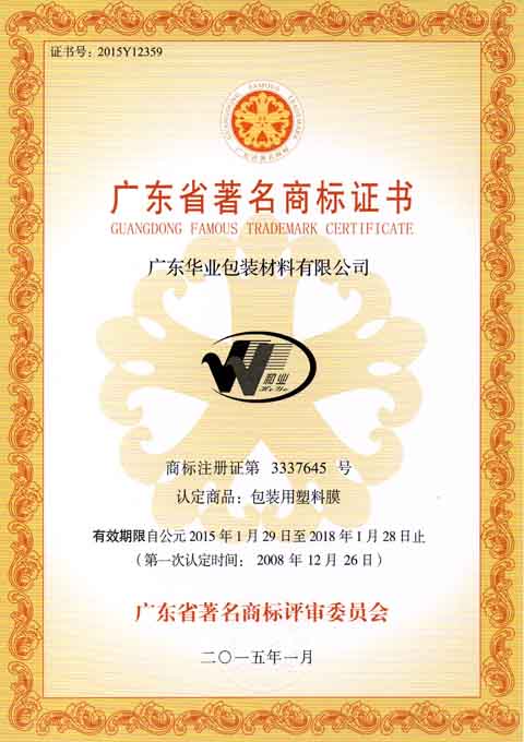 经广东省著名商标评审委员会综合评估研究决定,授予“和业牌”系列包装用塑料膜为“广东省著名商标”称号,这是对我司长期以来的不懈努力的认可,同时也承载了广大消费者对我司的厚爱,成为华业发展道路上一个重要的里程碑。