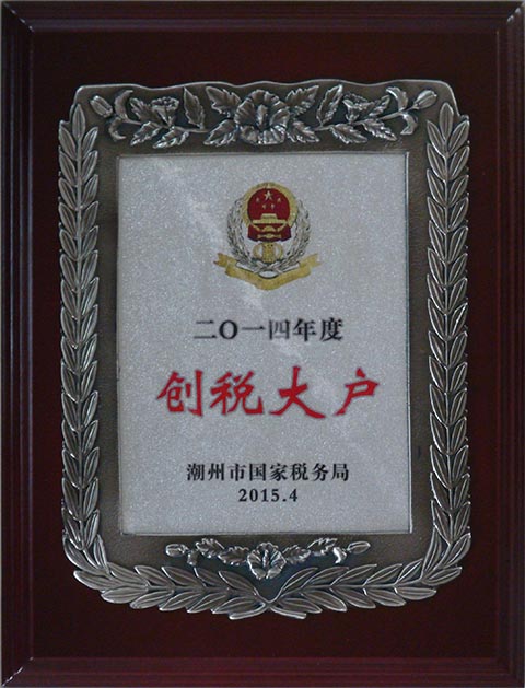 2014年,我司严格遵守税收法律法规、自觉履行纳税人义务,为潮州市税收收入做出了贡献,被市国家税务局评为2014年度“创税大户”。
