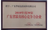 公司被评为“2010年度广东省最具核心竞争力企业”。